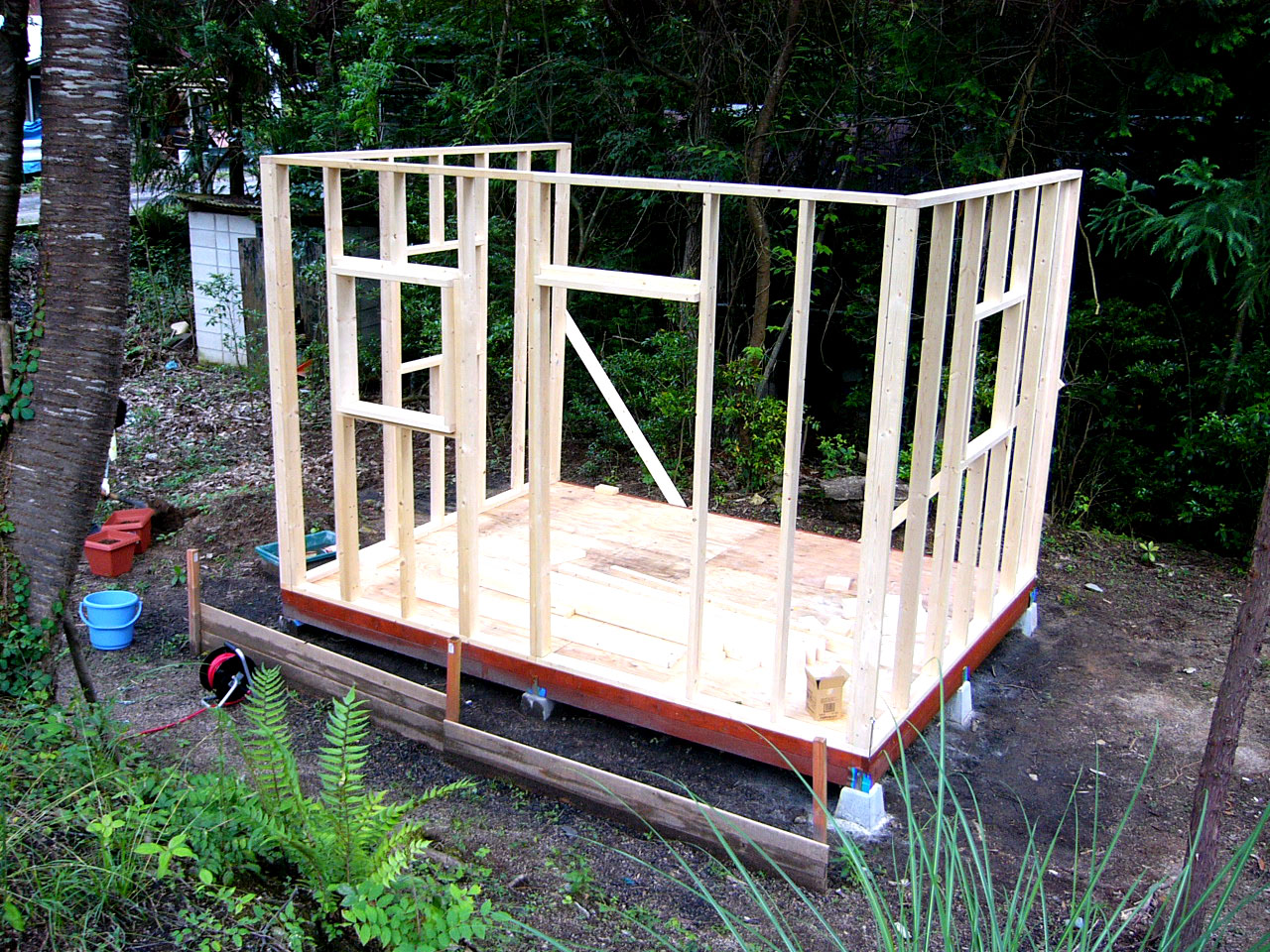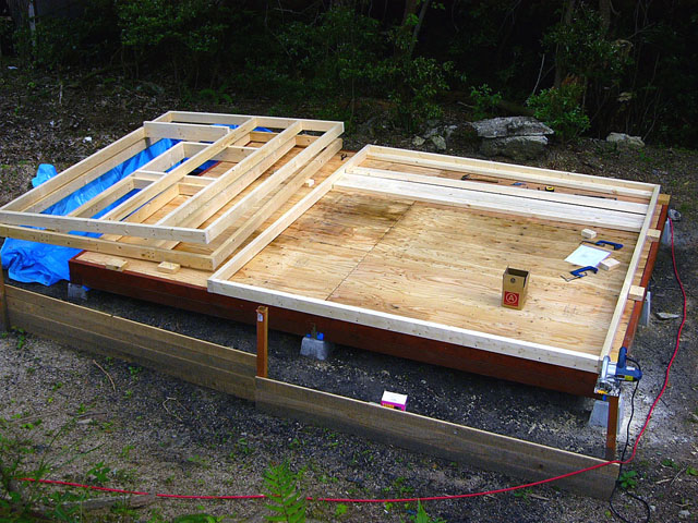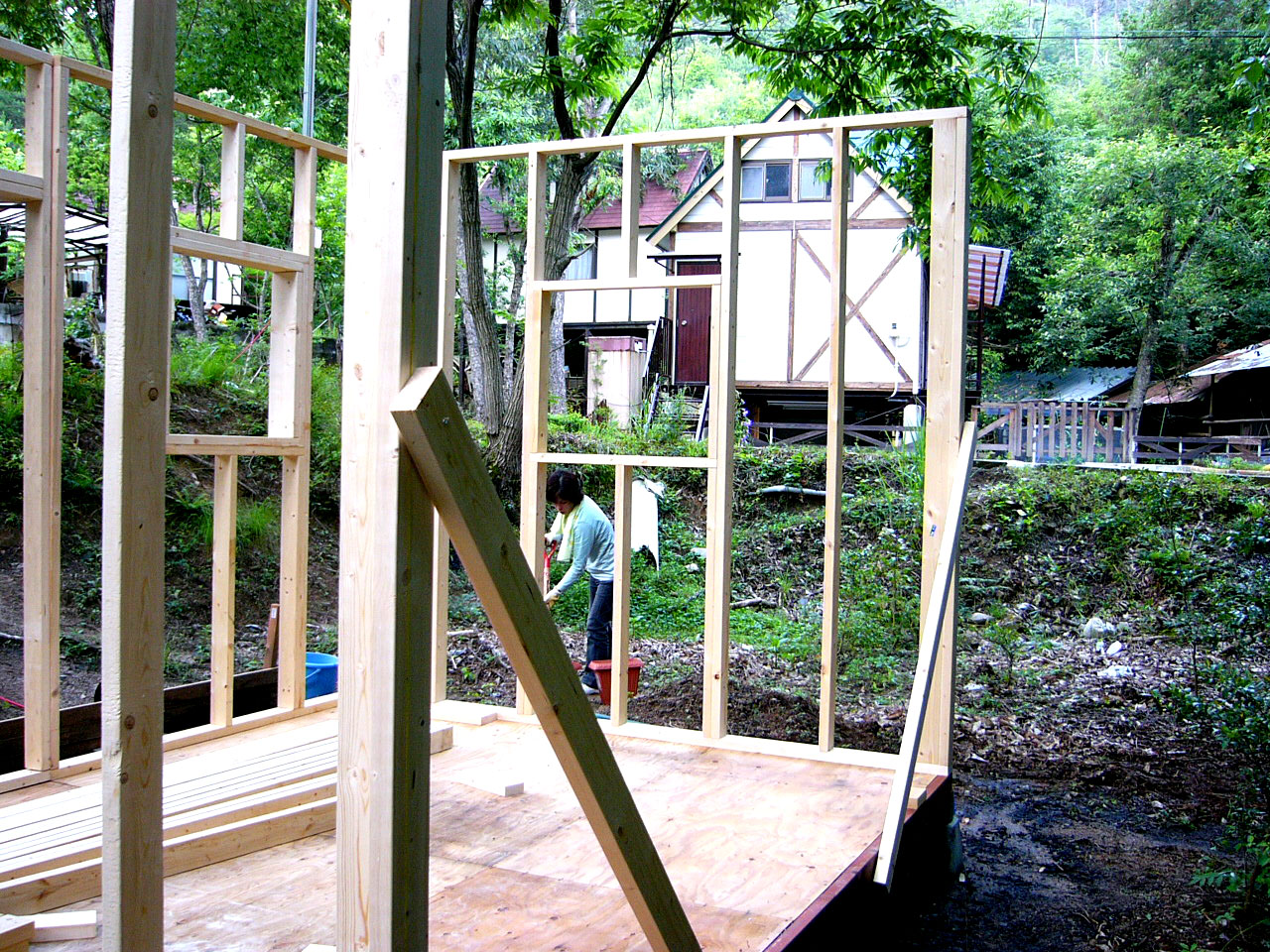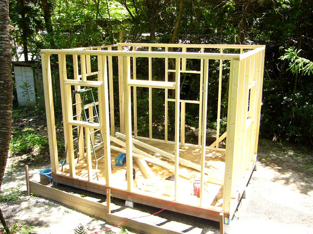 四方の壁を組んでいきます。長辺の壁は2つに分割。(一人ではつらいから。全て一人でやっています。)