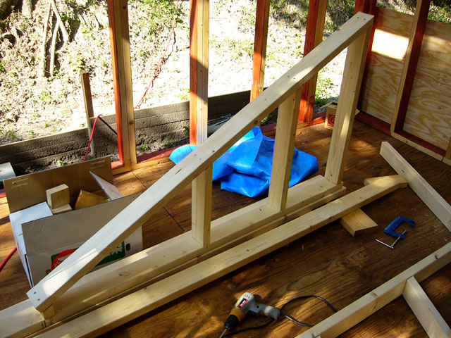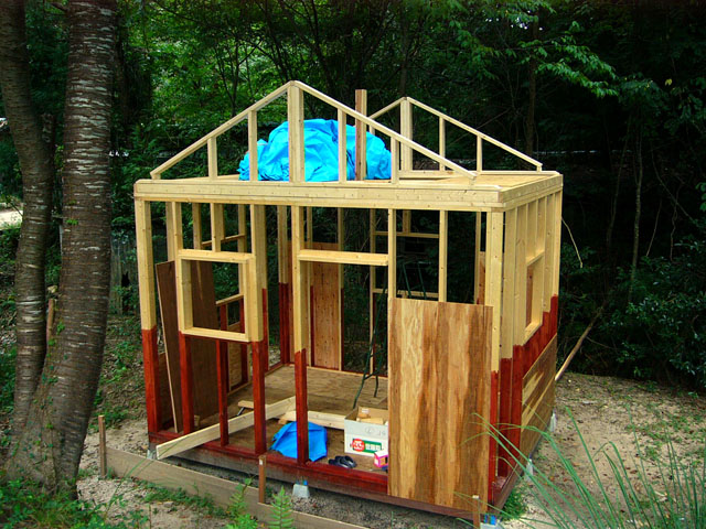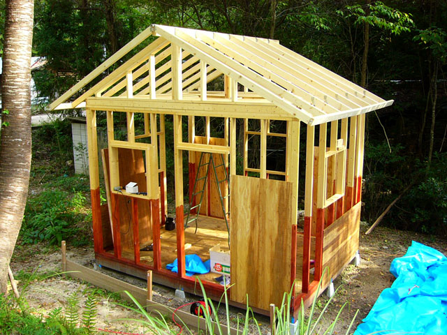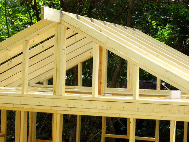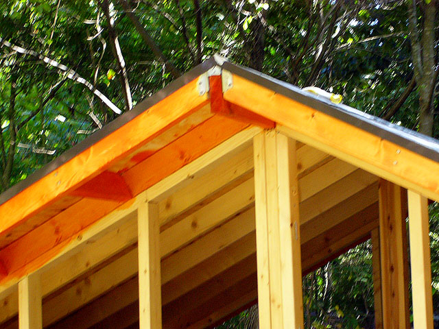 まず、棟木(2x6材)を取り付ける。垂木(2x4材)の端を斜めに切り落としたものを棟木にZ金具で固定して行く。