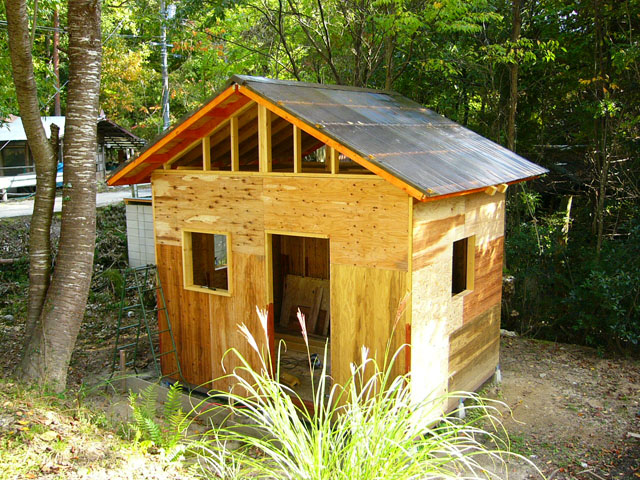 ルーフィングの上に桟木(30mm角材)をとめ、ポリカーボネイトを 桟木に固定。一度滑って落ちそうになった。
