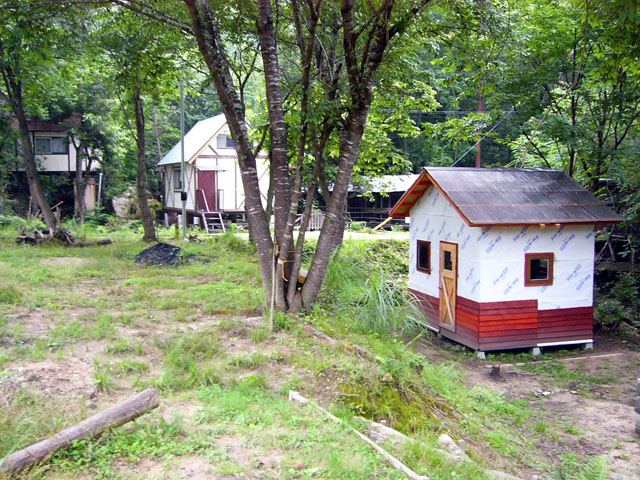 工房は、「透湿防水シート」なるものをタッカーで貼りました。 湿気は通すが水は通さないそうです。外壁を張り始めます。 「鎧張り」というそうですが、要は板を一部重ねながら留めて行く。 水平器を当てながら。