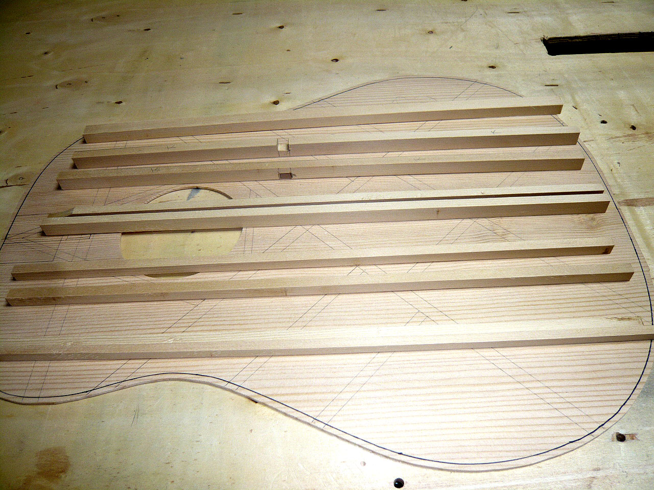 準備ができたら接着に入ります。まずXブレーシングから。写真の様な治具を作りましたが、あまり意味は無かったみたい?!