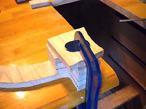 左の写真は、右半分に端材を三段にして接着したところ。右上のは、横から見たところ、右下は圧着しているところです。(2005/10/02現在)