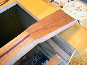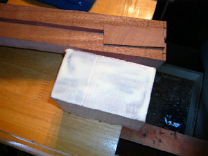 糸鋸でひいひい言いながらカットしました。カット面がガタガタです。後で綺麗に・・・・・・ヒールとボデイの固定部分用にマホガニーの角材を接着します。接着待ち時間にボデイを磨きます。ペーパーを角材に張り付けたもので一心不乱に!接着が終わったので、側面に大まかな線を罫書きます。今日はここまで、で終わりにして、ペーパーを張り替えておこうと両面テーブをカッターで切っておこう。ついでに指先までスッパリ切ってしまいました。いつも、刃先の進行方向には体の部分は置かない様ににしているのに。このときだけは何も考えずにやってしまいました。いつも集中しておかないと!