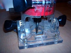 表板のロゼッタ(口輪)の溝掘りと接着です。まず、サークルカッターで1mm位の深さで切り込みを入れます。円の中心点の裏側に堅い木片を張り付け、細い釘を打ち込みます。これをトリマーの治具の中心にして1mm位の深さに掘ります。トリマーを扱いなれていないせいか、力が入りすぎて若干、円が変形したかな?何事も経験ですな!