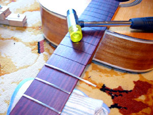 フレットを打ちます。心がはやります。ニッパーで切っては両端をヤスリで処理して打ち込みます。トンカチはゴム、プラスチックのものです。20本完成するまで相当の時間かかります。ここまで来たら、エンドピン、ペグブッシュも取り付けて、いよいよ全体像が見えてきました。眺めた感想は、悔しい!!