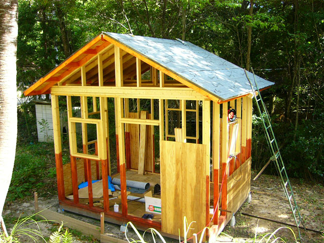 まず、棟木(2x6材)を取り付ける。垂木(2x4材)の端を斜めに切り落としたものを棟木にZ金具で固定して行く。