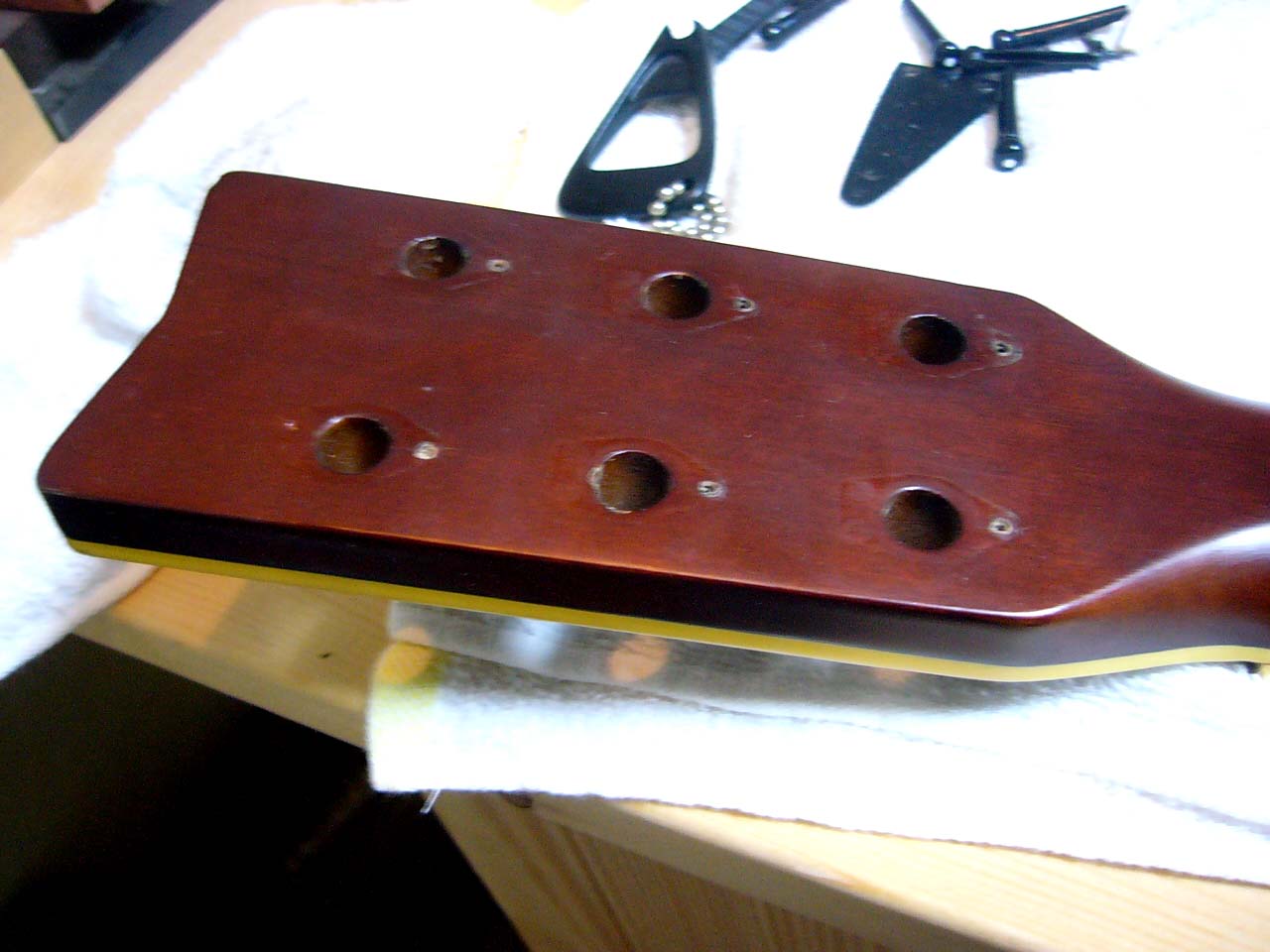 ペグを取り外し、清掃しています。ビスが少しゆるい箇所があったので、タイトボンドを少量入れています。 |