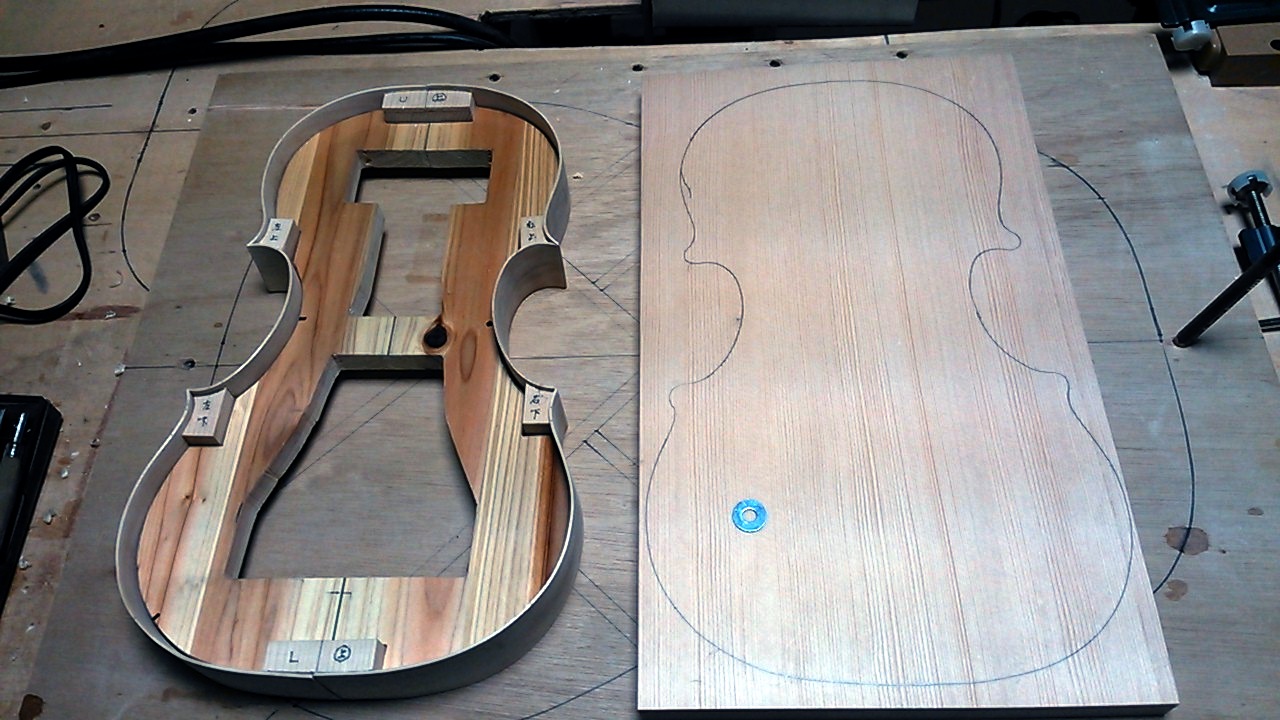 図面から厚さの等高線を写し取ります。適当です。どこの厚さがどれ位か、タッピングしてみてもどういう音がいいのか