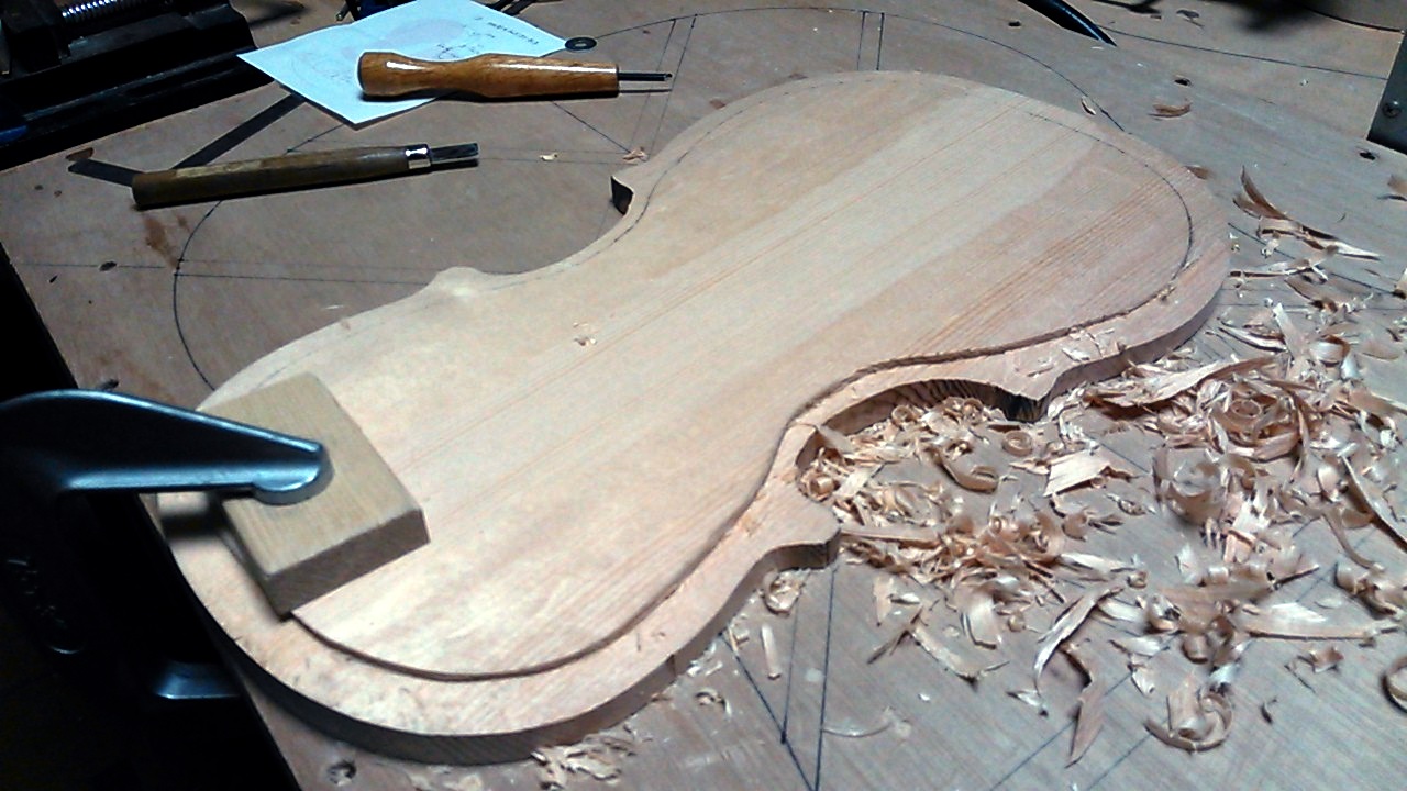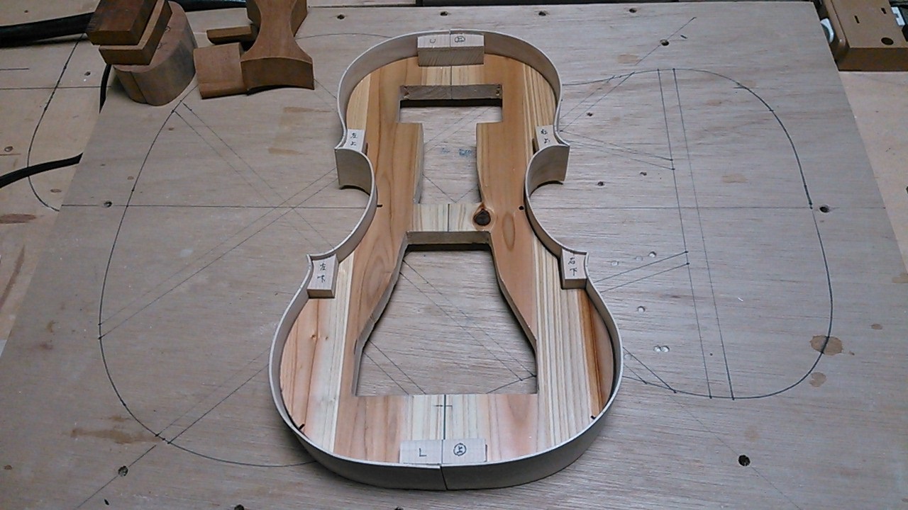 以前、壊れかけたバイオリンを分解し、組み立てたことがあるのですが、1から作るには??? ネットで色々調べて、製作自体はだいたい解ったのですが、図面がありません。 探していると製作本の中に図面があったので、迷わず購入。 ギターは何本も作っているし、構造もわかりました。道具も事足りるし、ギターより小さいし、割と楽に..... と思ったのが、後でじわじわとボディブロー(実際どの様なものかは知りませんが)のように。反省! |